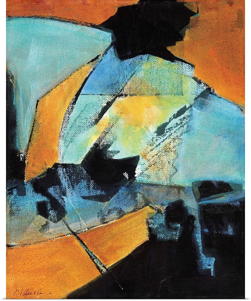 <p>Abstract painting of complied random shapes in shades of blue, orange, and black</p>