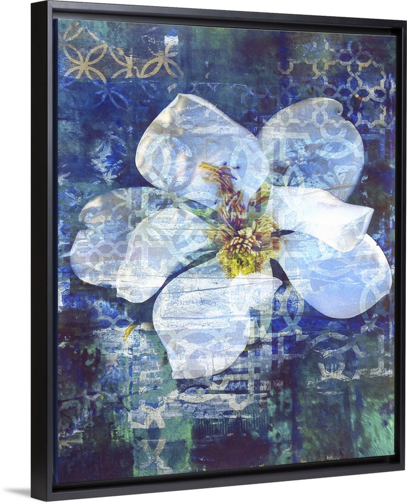 <p>A painting of a single white magnolia flower on a blue and green background with tan designs.</p>