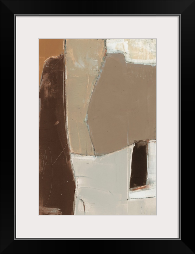 <p>Abstract painting featuring layered organic and geometric shapes in a muted palette of earthy browns, tans, creams, and whites, with visible texture and subtle lines, creating a calm, contemporary aesthetic.</p>