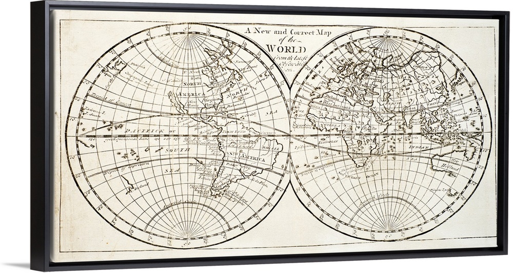 <p>Large antiqued map of the word print with two circles next to each other and the different land masses drawn and labeled in them.</p>