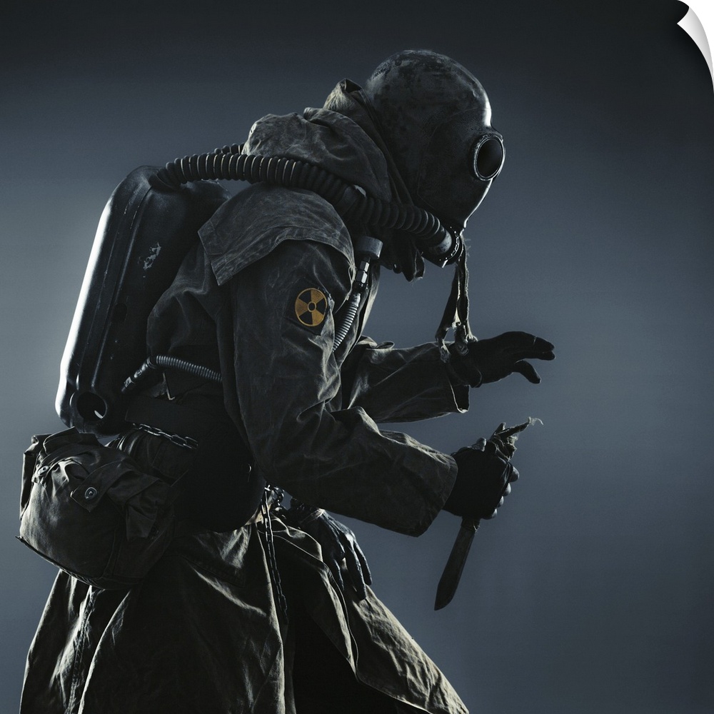 <p>Studio shot of post apocalypse survivor in tatters and gas mask.</p>