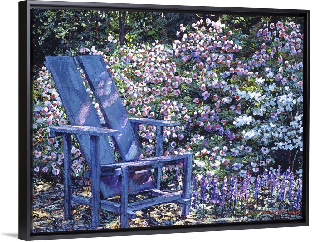 <p>Impressionist paintng of a blue garden chair surrounded by blooming shrubs.18 x 24" acrylic on canvas</p>