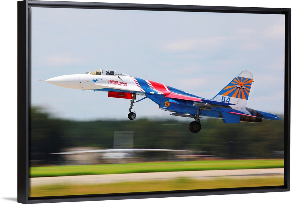 <p>Su-27 jet fighter of the Russian Knights aerobatics team taking off.</p>
