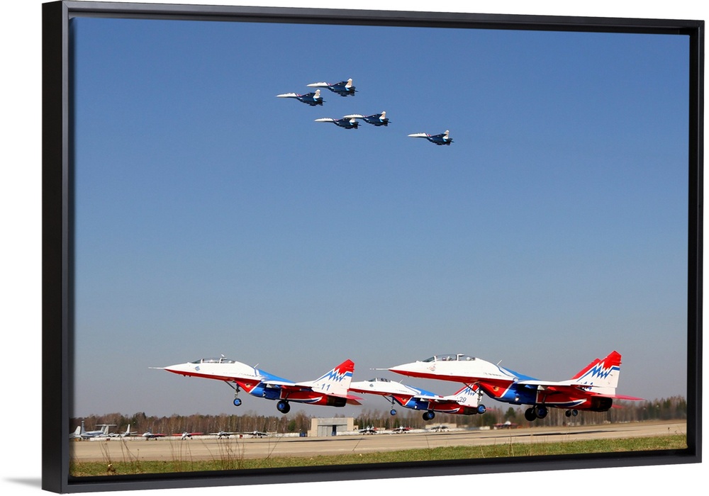<p>Su-27 of the Russian Knights and MiG-29 jets of the Swifts Russian aerobatics teams.</p>