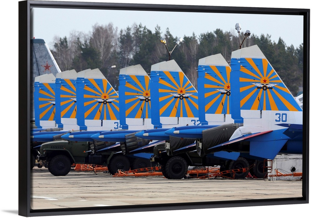 <p>Su-30SM jet fighters of the Russian Knights aerobatics team.</p>