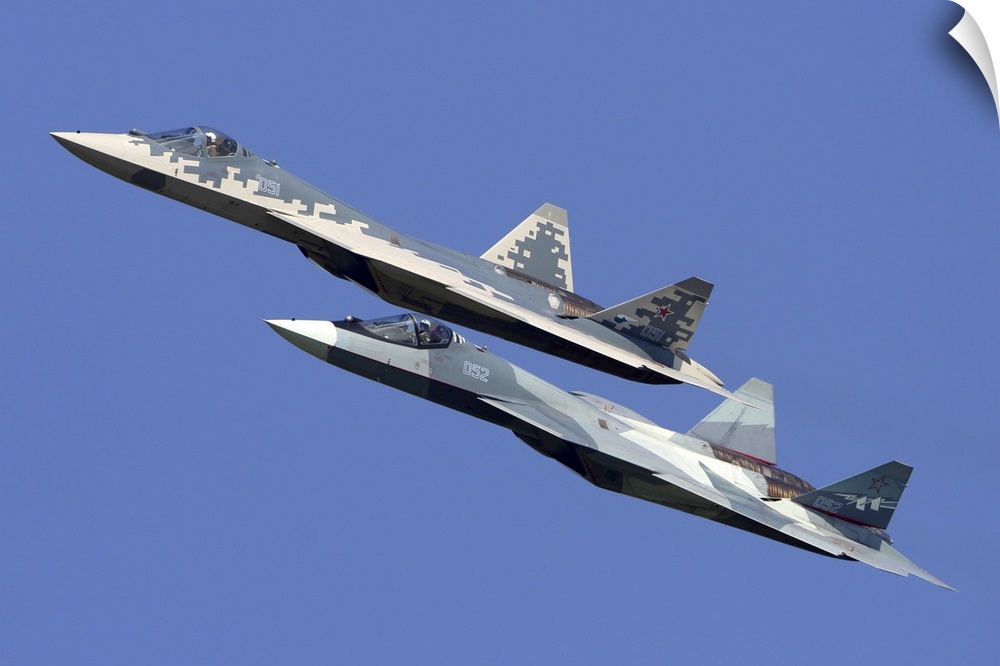 <p>Sukhoi Su-57 (T-50) jet fighters of the Russian Air Force performing demonstration flight at MAKS-2019 airshow in Zhukovsky, Russia.</p>