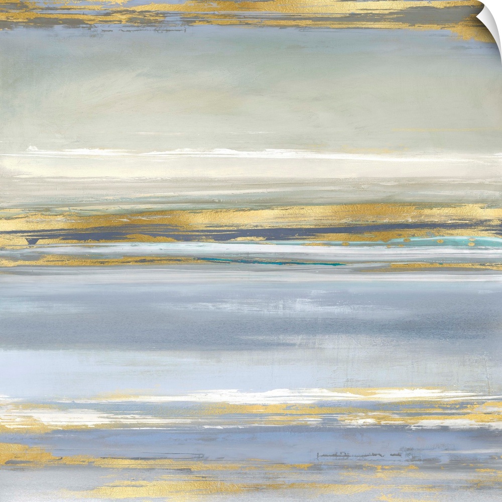 <p>Contemporary artwork featuring gold brush strokes on a soft blue background.</p>