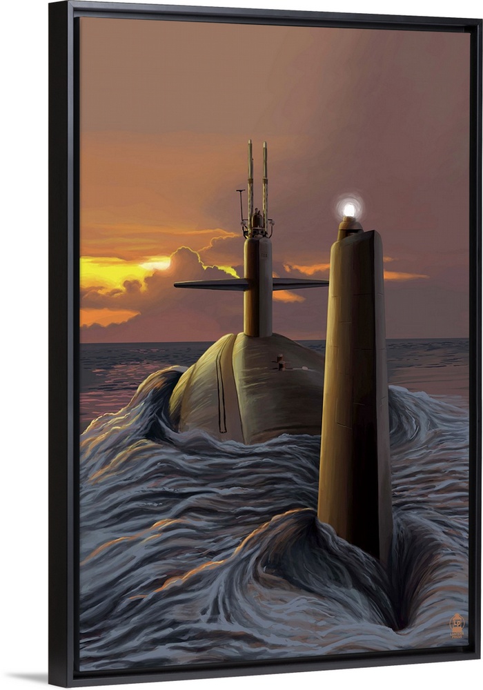 <p>Retro stylized art poster of a submarine at the surface of the ocean, with the sun setting in the background.</p>