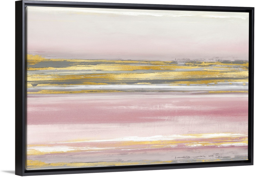 <p>Contemporary artwork featuring gold brush strokes on a soft pink background.</p>