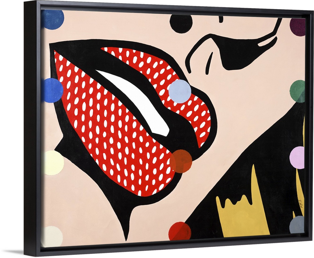 <p>Pop art style painting with a close up of a woman's face highlighting her red lips, with white dots on top and colorful dots in the foreground going up and down the painting in lines.</p>