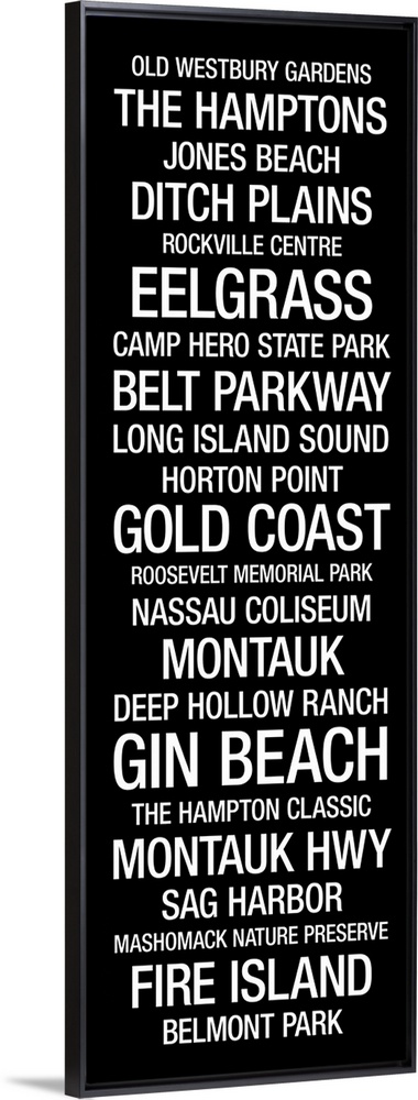 <p>Tall canvas of a vertical list of the different areas in Long Island.</p>