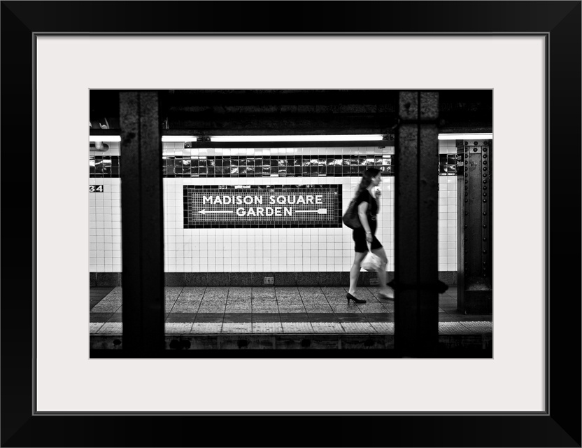 <p>Black and white photo of a subway station at Madison Square Garden, with a woman walking past.</p>
