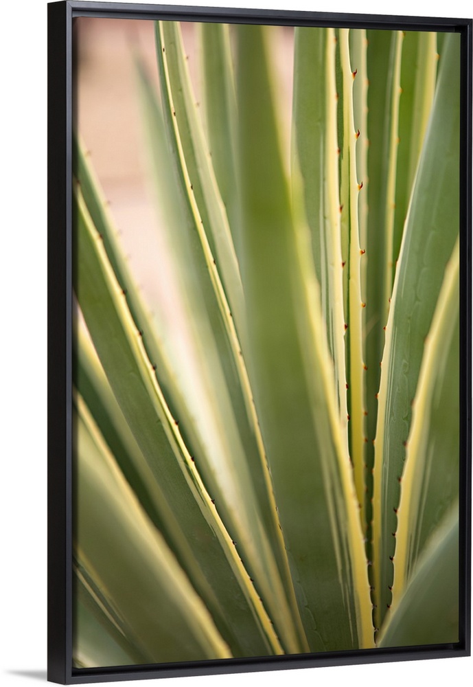 <p>Close-up photograph of a succulent with long green and yellow leaves with small pricks lining them.</p>