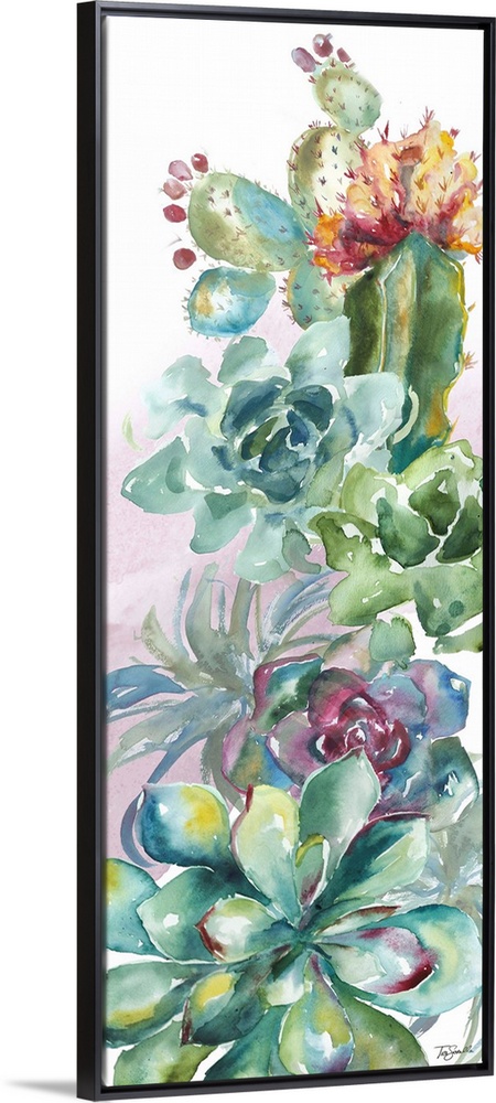 <p>A vertical decorative watercolor painting of a group of succulents in a garden.</p>