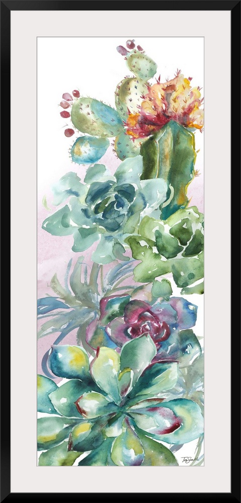 <p>A vertical decorative watercolor painting of a group of succulents in a garden.</p>