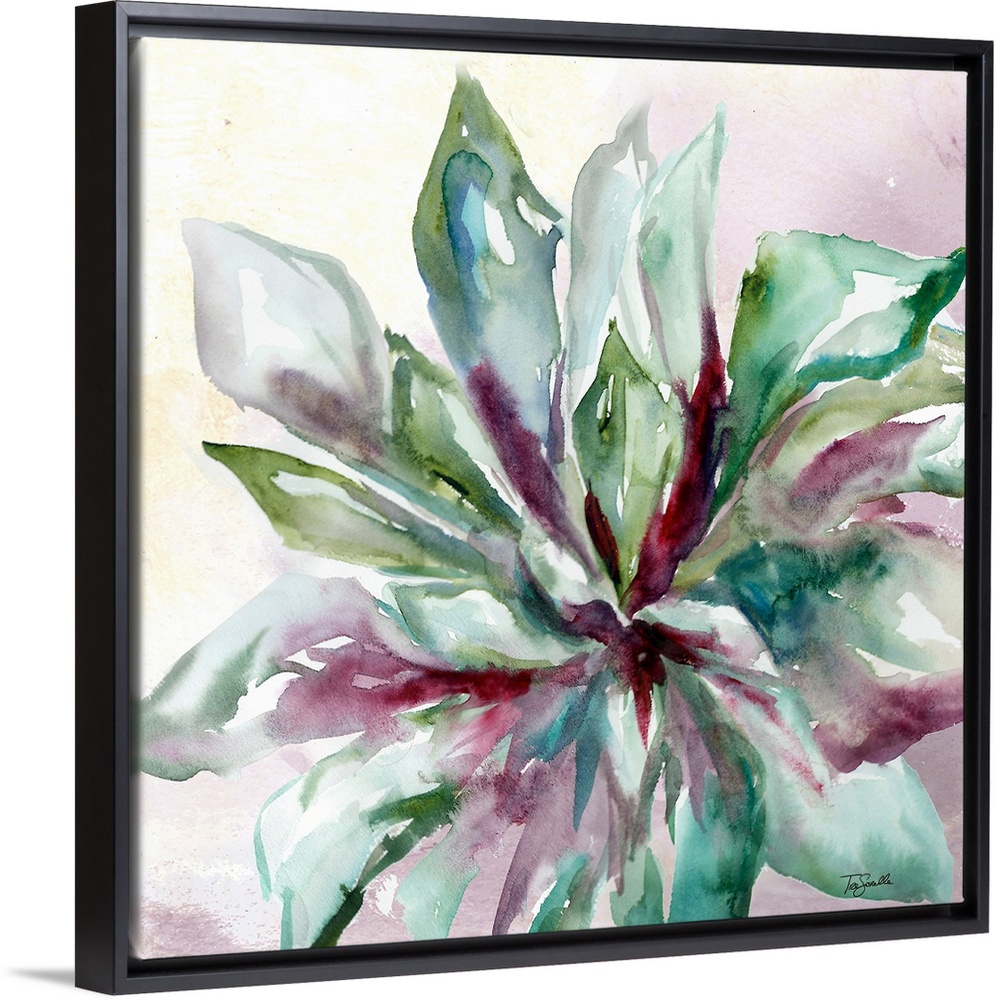 <p>A square decorative watercolor painting of a group of succulents in a garden.</p>