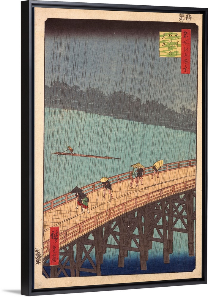 <p>The heavens open. The sudden shower, a favorite subject of Edo haiku poets and ukiyo-e artists, is often depicted with a crisscrossing pattern of fine lines of rain-a difficult woodblock technique. Here, the netlike pattern is superimposed over an intensely focused image of Ohashi (the Great Bridge), which crosses the Sumida River.</p>