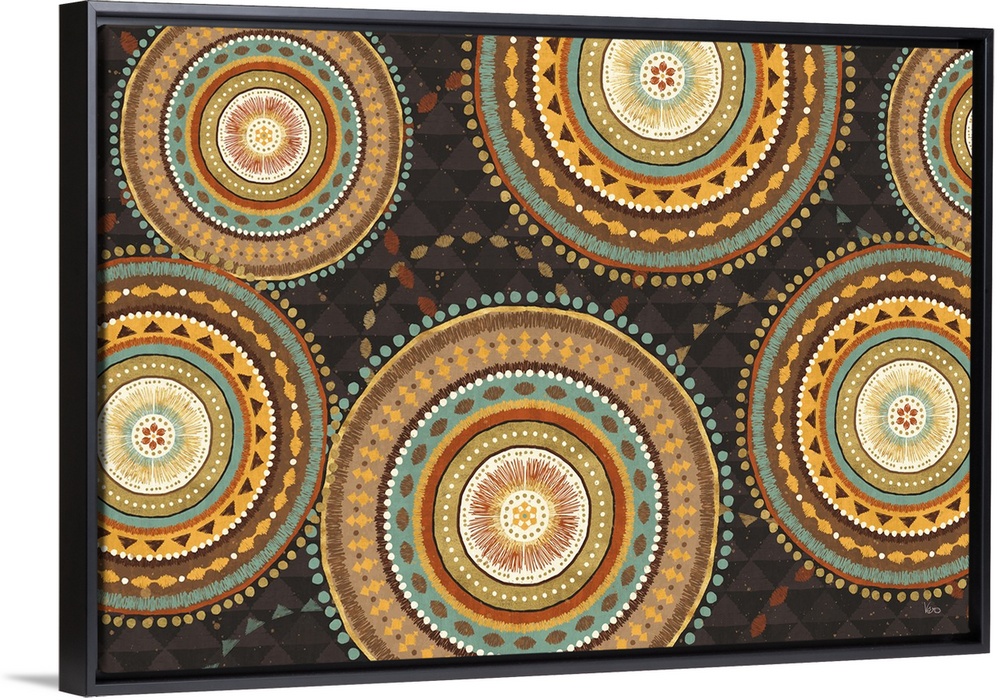<p>A decorative design of multi-colored patterned medallions in warm earth tones on a triangle pattern background.</p>