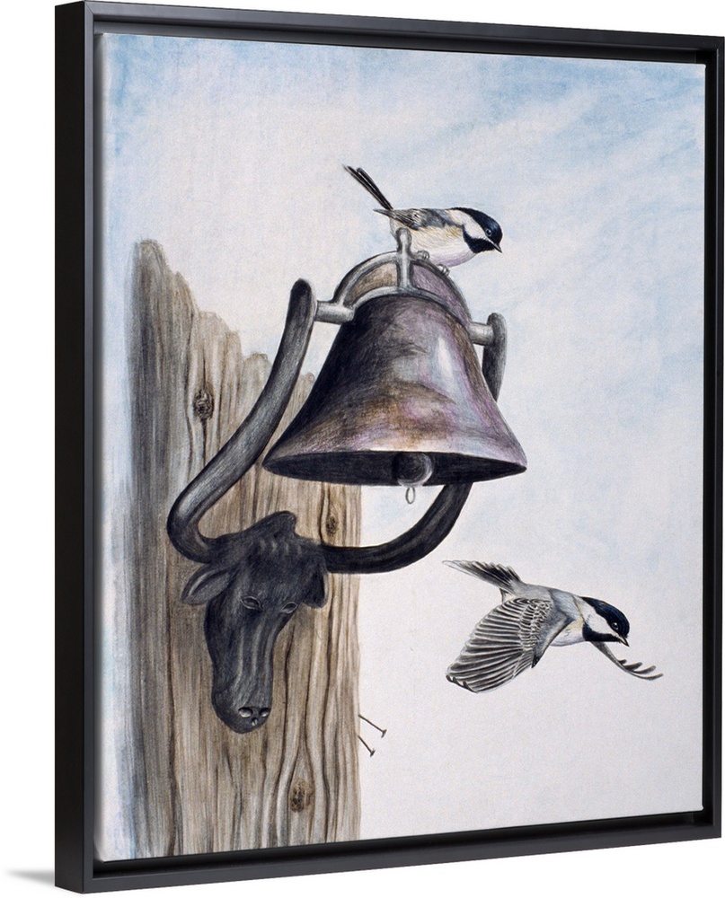 <p>Two chickadees, on perched on the bell and one flying away from it.</p>