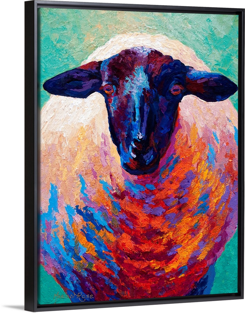 <p>This is a contemporary painting of a sheep where the shadows have been painted with vivid and uncommon colors not normally found in nature.</p>