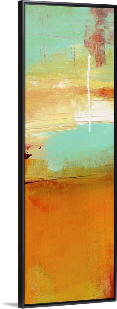 <p>Oversized, vertical, contemporary artwork in warms tones that transition to cool using patchy, random brushstrokes and small lines.</p>