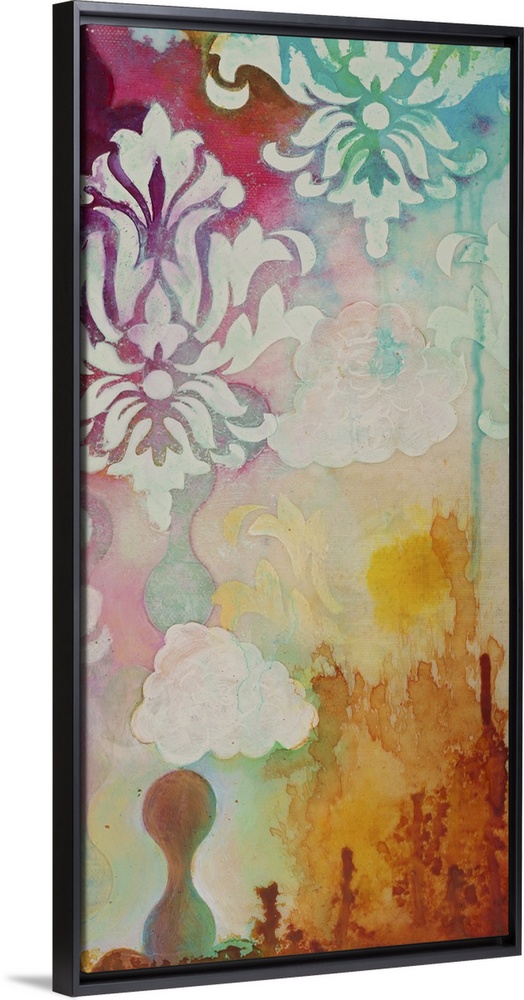 <p>Abstract artwork in shades of turquoise and magenta with floral shapes and damask elements.</p>