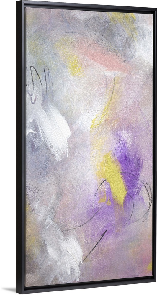 <p>Contemporary abstract painting in white and yellow with bright purple.</p>