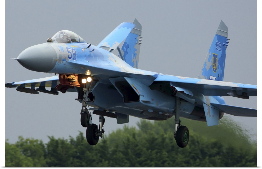 <p>Sukhoi Su-27 jet fighter of the Ukrainian Air Force landing during RIAT-2017 airshow, Fairford, England, United Kingdom.</p>