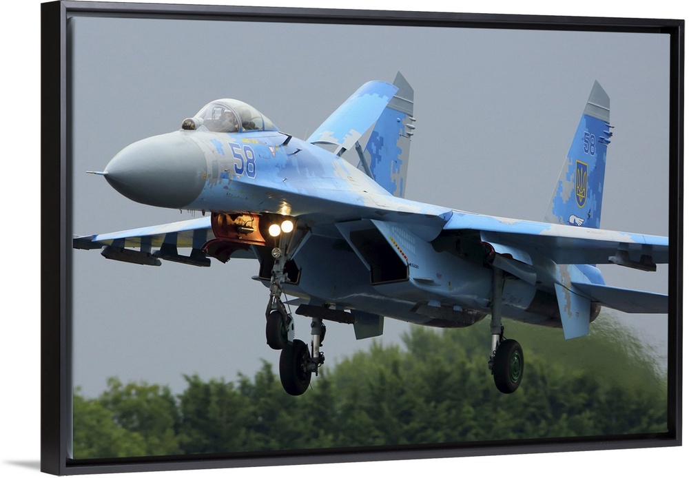 <p>Sukhoi Su-27 jet fighter of the Ukrainian Air Force landing during RIAT-2017 airshow, Fairford, England, United Kingdom.</p>