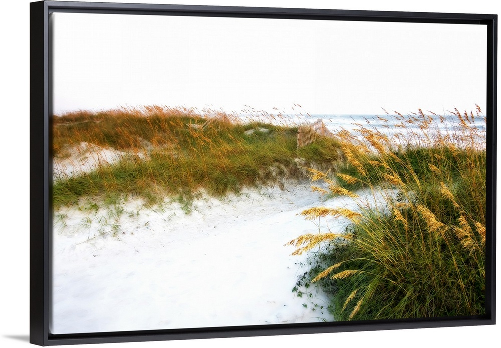 <p>This landscape photograph of a sandy beach and sea grass blowing in the wind that has been edited to have a soft focus and dreamy quality.</p>