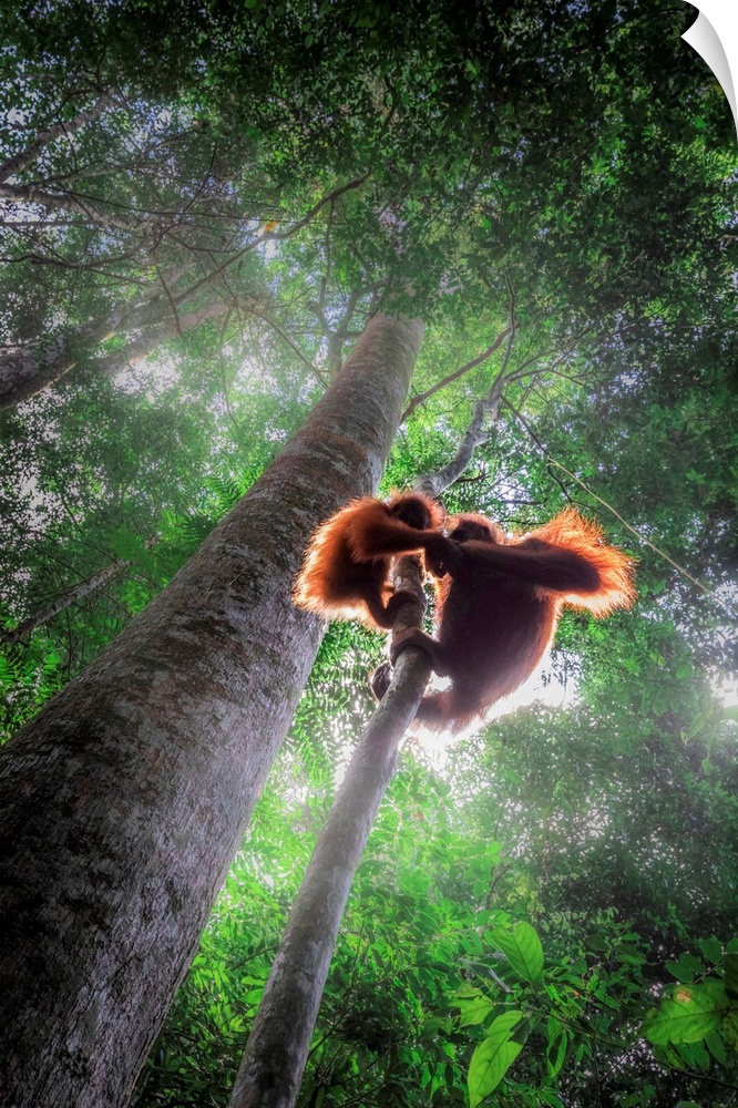 <p>Sumatran Orangutan Mother With Baby Climbing A Tree In Gunung Leuser National Park, Northern Sumatra</p>