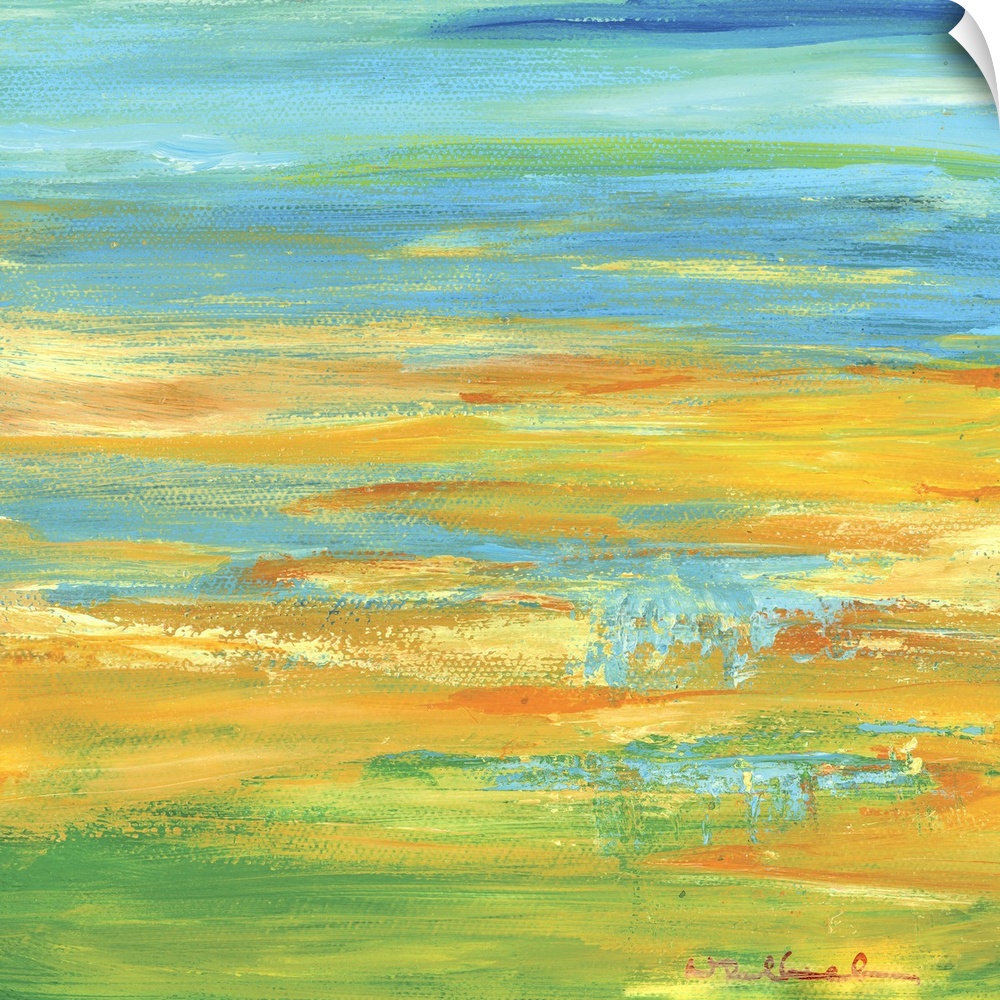 <p>Square abstract painting in shades of orange, yellow, green, and blue resembling a Summer landscape.</p>