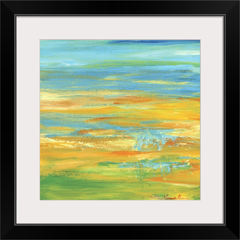 <p>Square abstract painting in shades of orange, yellow, green, and blue resembling a Summer landscape.</p>