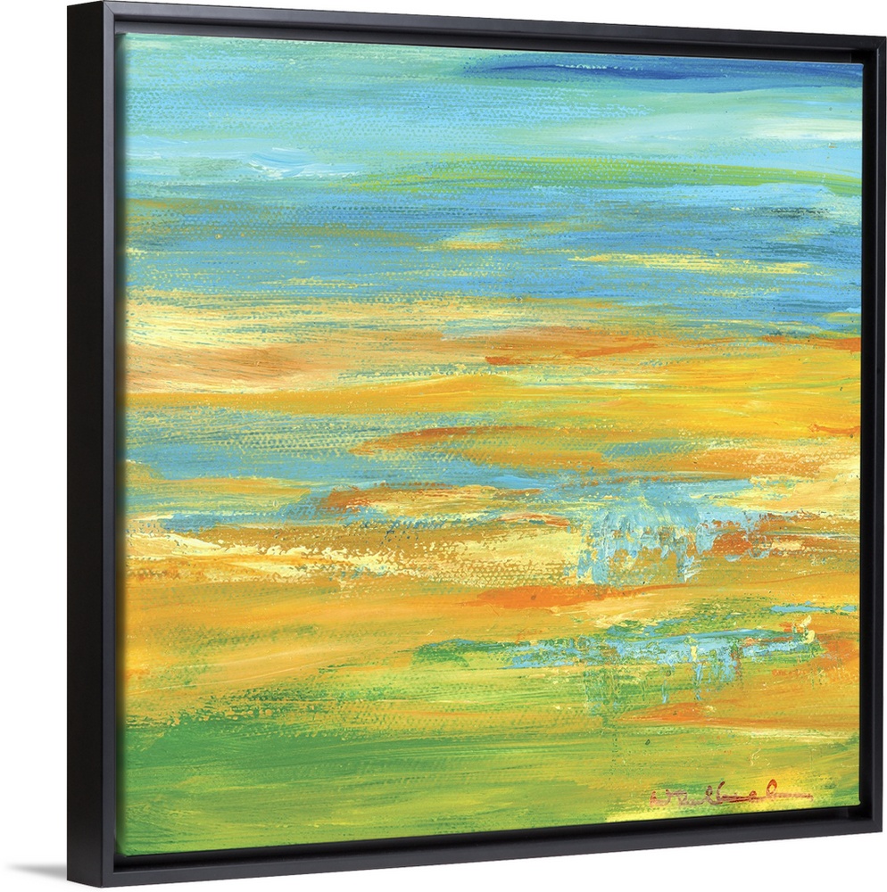<p>Square abstract painting in shades of orange, yellow, green, and blue resembling a Summer landscape.</p>