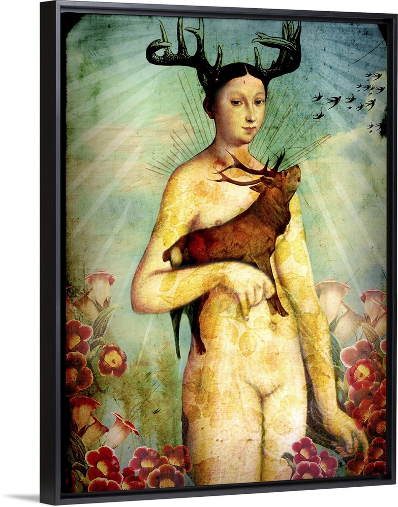 <p>Composite artwork of a nude woman with antlers holding an elk, surrounded by flowers.</p>
