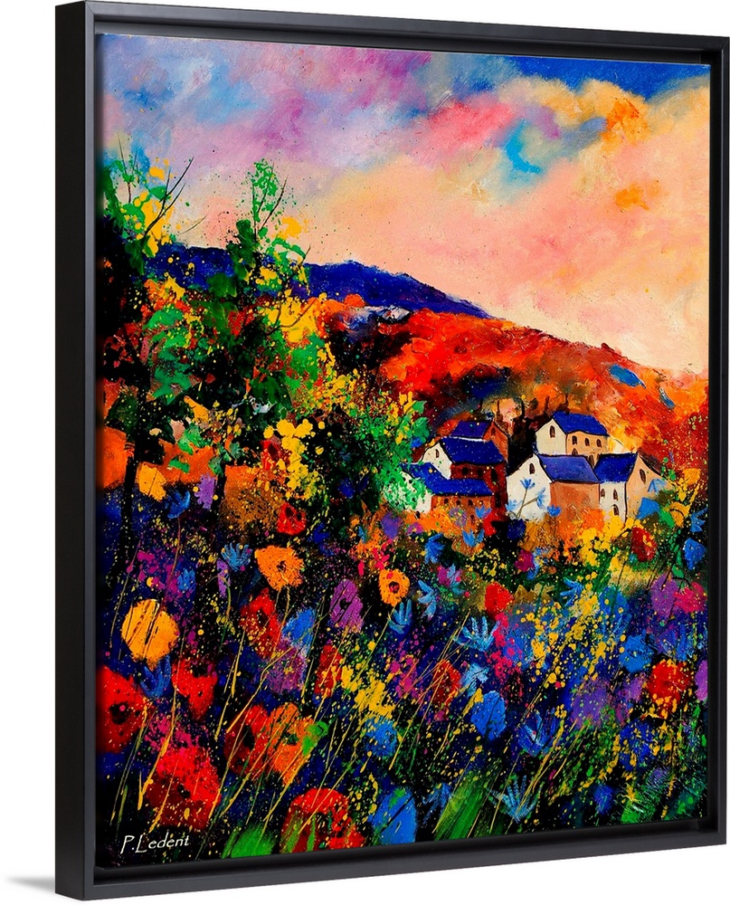 <p>A field of multi-colored flowers in front of a group of houses on a colorful summer day in the countryside.</p>