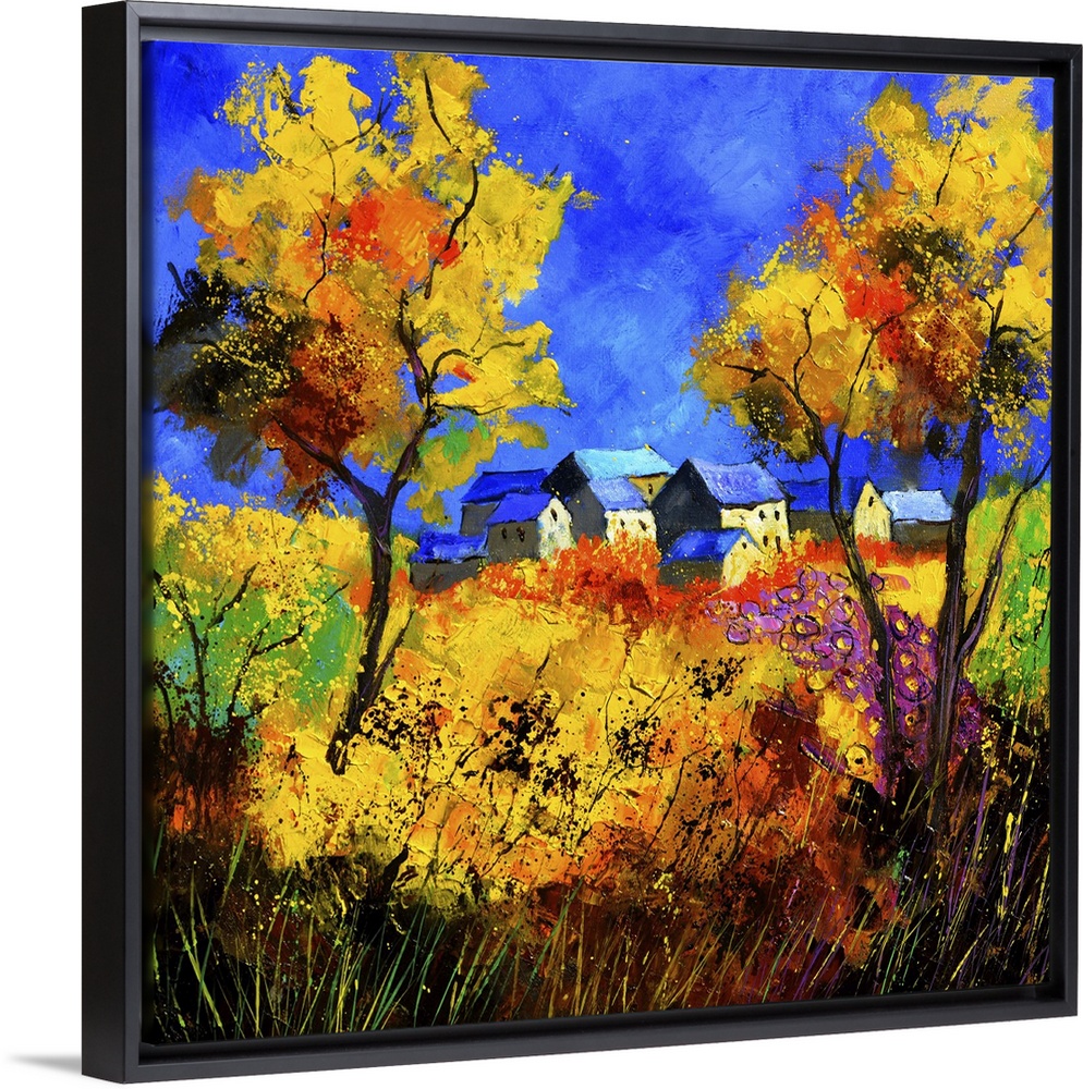 <p>Square painting of a summer landscape with a colorful field in the foreground and a Belgium village in the background with bright blue sky in the distance.</p>