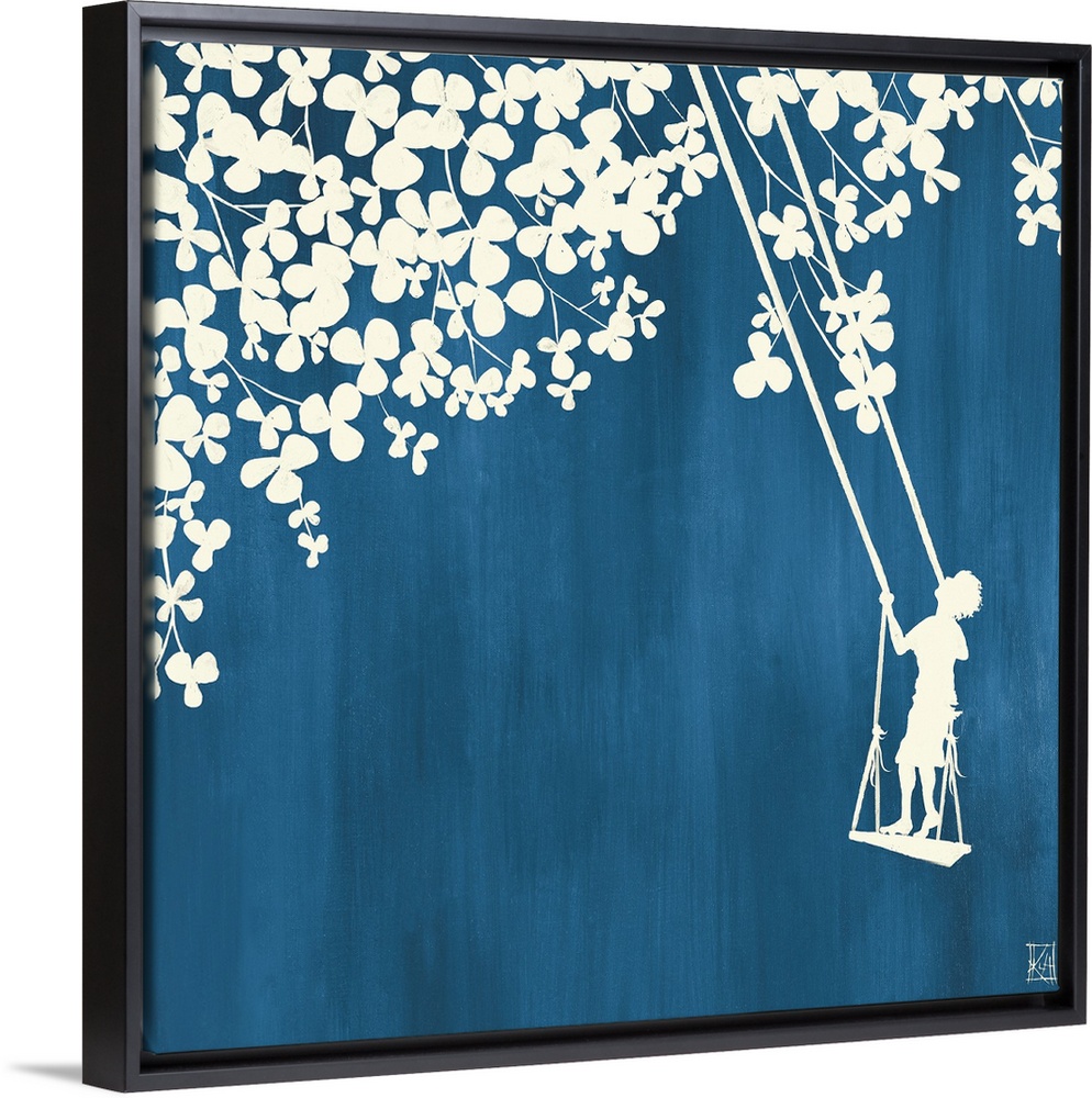 <p>Square canvas art of the silhouettes of a plant with various leaves or petals and a boy standing on a swing looking upwards towards it.</p>