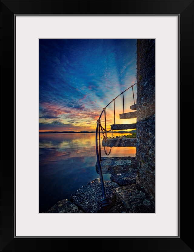 <p>Sunset over an Irish lake with stairs in the foreground</p>