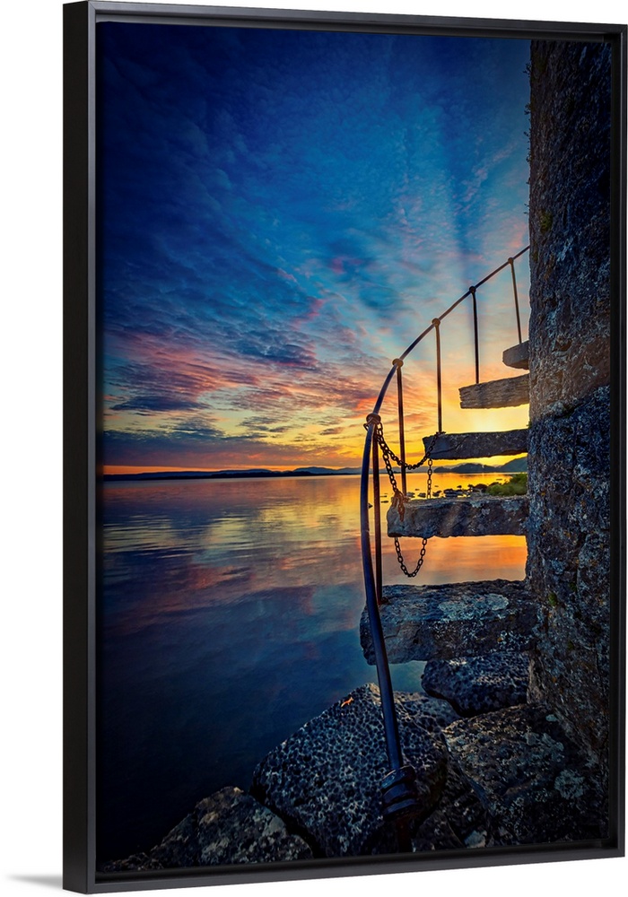<p>Sunset over an Irish lake with stairs in the foreground</p>