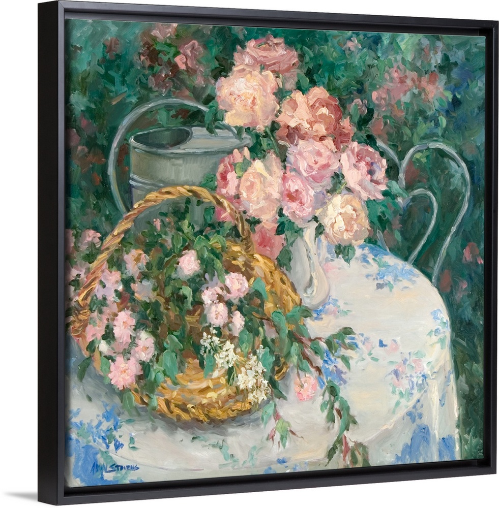 <p>Fine art oil painting still life of a beautiful table filled with pink roses and flowers in a basket with a watering can by Allayn Stevens.</p>