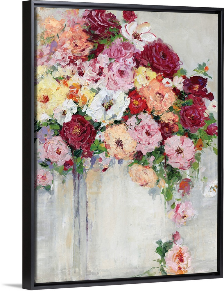 <p>Vertical painting of a colorful flower arrangement on a gray toned background.</p>