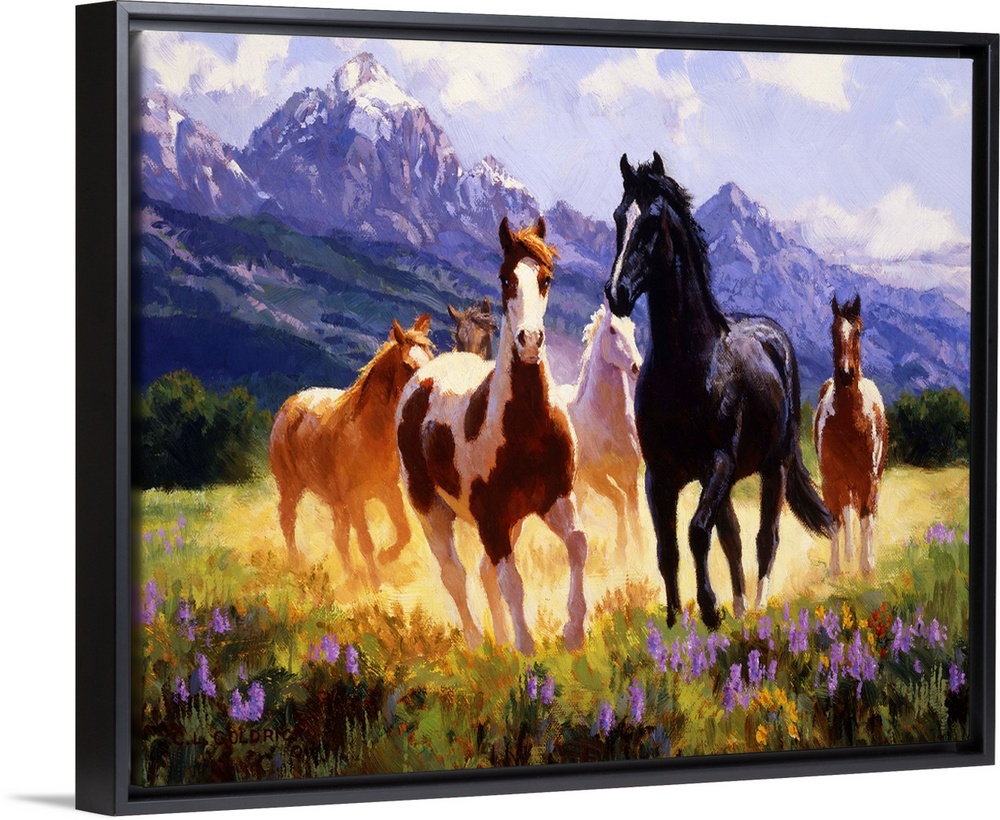 <p>Contemporary colorful painting of a herd of horses running through a meadow, with a mountain range in the background.</p>