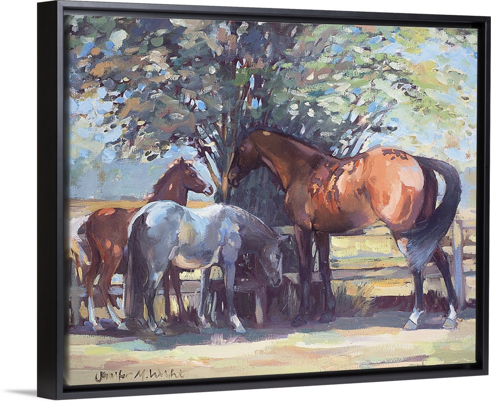 <p>Contemporary painting of a horse and ponies in the shade in summer.</p>