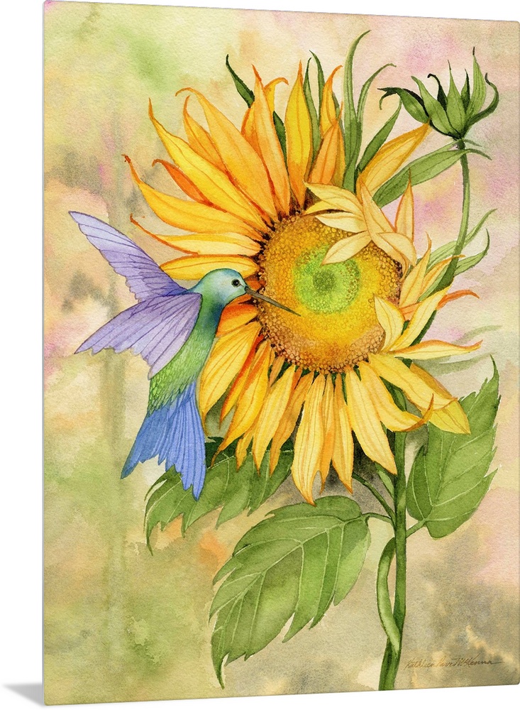 <p>A vertical watercolor painting of a hummingbird at a large sunflower bloom with a muted multi-colored blurred background.</p>
