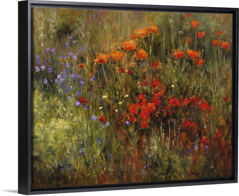 <p>Contemporary painting of an idyllic countryside scene with blossoming flowers.</p>