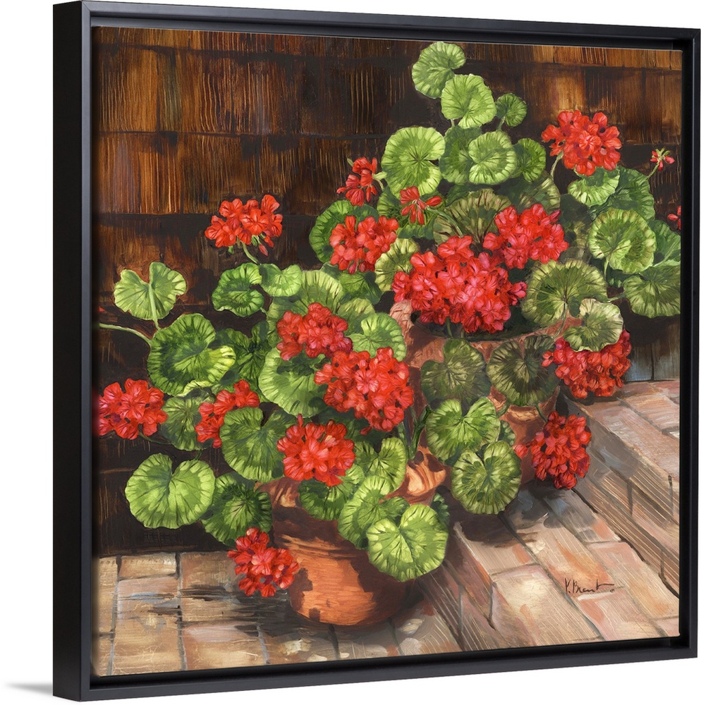 <p>Contemporary painting of a group of potted geraniums on brick stairs.</p>