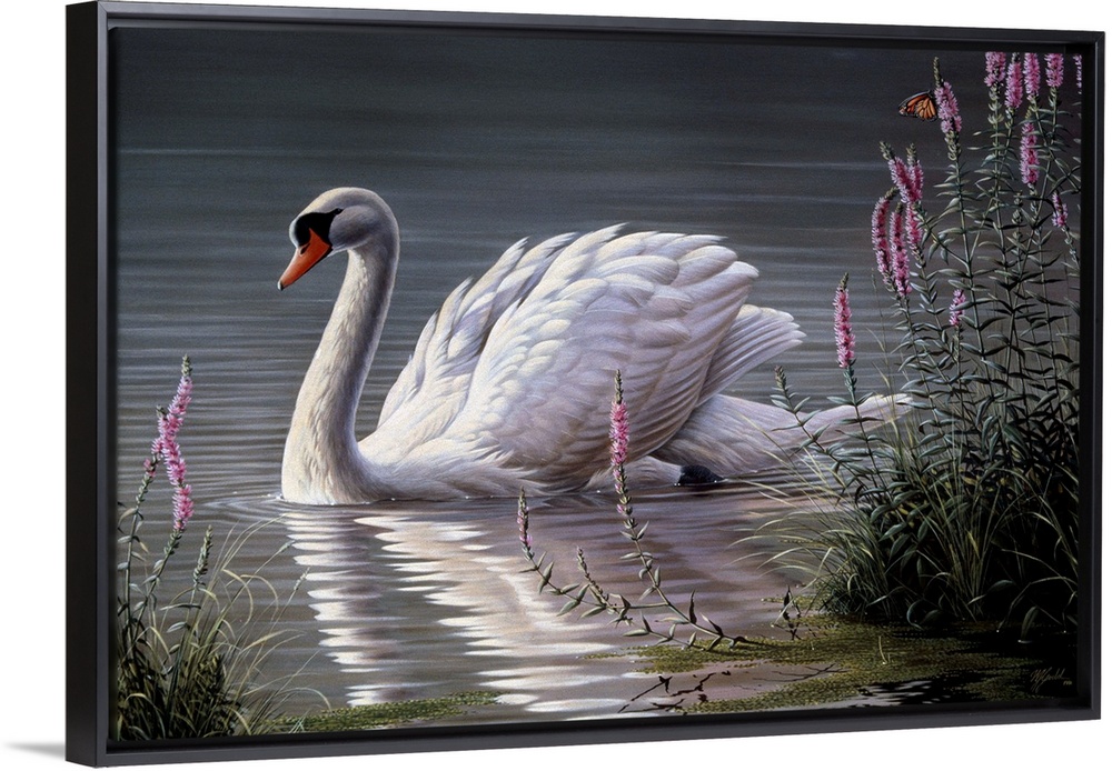 <p>Mute swan on a pond by some pink flowers.</p>