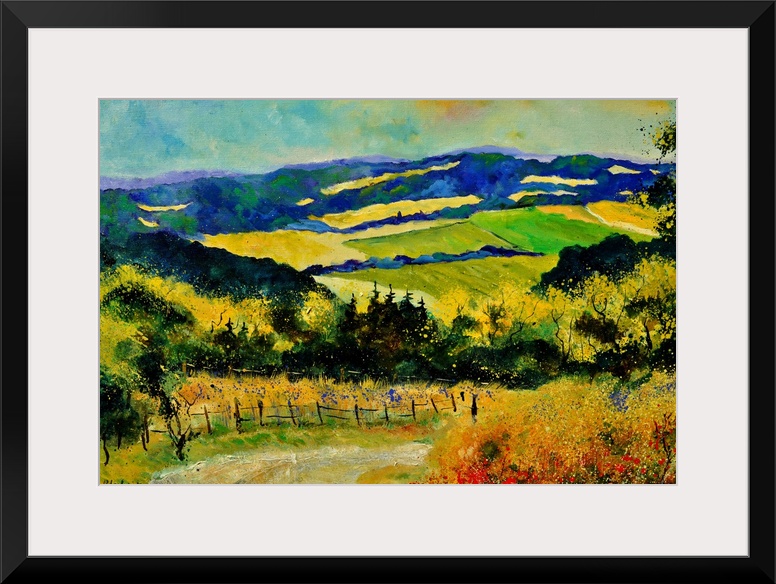 <p>Horizontal landscape of rolling fields in vibrant colors on a summer day.</p>