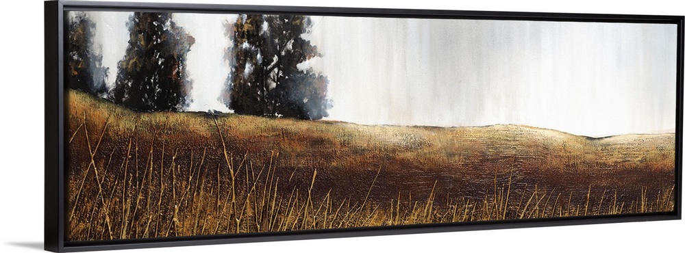 <p>Contemporary panoramic painting of a field of grass in shades of brown with a few trees along the horizon.</p>